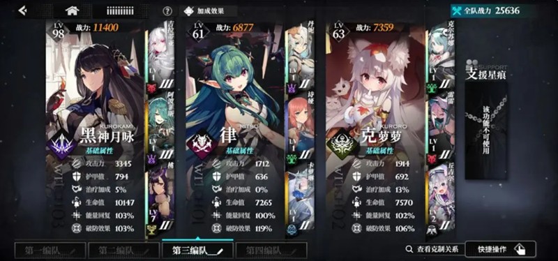 助战位的选择对侵蚀队的发挥同样重要,卡罗琳取代传统增伤型助战,凭借定身控制和减抗技能重构战斗节奏。她的技能在三回合内减抗,正好契合侵蚀队的启动周期,使得主C能在第一时间打出高额伤害。相比之下,雷雷等常规助战虽能提供即时收益,却会挤占被动蓄能资源,得不偿失。