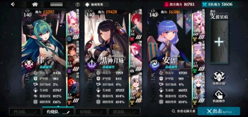 黑神是当前版本最优的灼烧施加者,其技能组不仅能高效挂载灼烧状态,还能通过高攻面板放大每次灼烧的伤害基数。围绕黑神构建的队伍通常包含三类职能角色:提供攻击力增幅的星痕、专职施加灼烧状态的角色,以及能够主动触发灼烧伤害结算的功能型辅助。