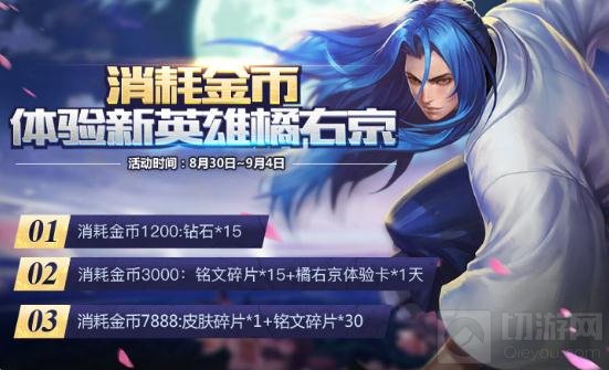 8月30日~9月11日,登录或参与游戏内对战获得橘右京碎片,收集60个即可兑换英雄:橘右京(兑换时间为8月30日~9月12日)