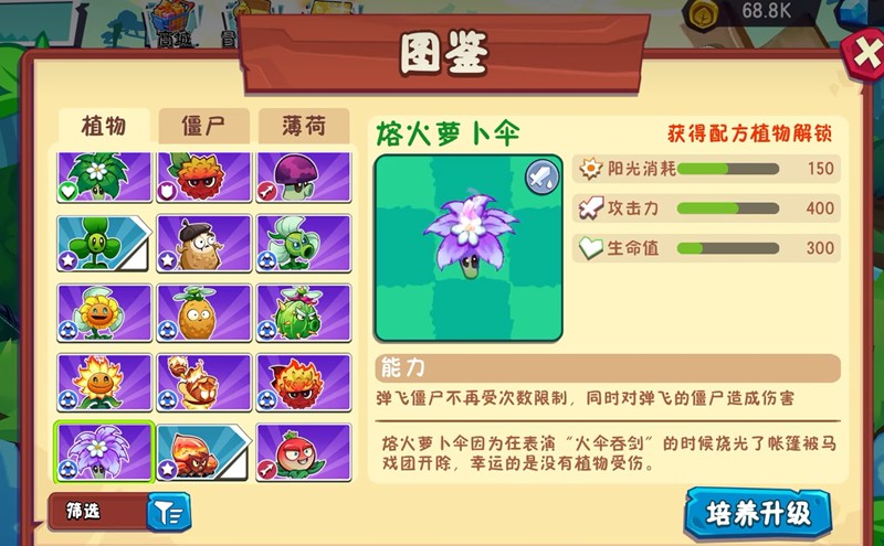 熔火萝卜伞由萝卜伞和岩浆玉露融合而来,融合时会对周围一格内的敌人造成爆炸伤害。它保留了萝卜伞弹飞空中敌人的能力,并且不再消耗次数,可以无限使用。这一特性让它在对抗飞行类僵尸时非常实用。