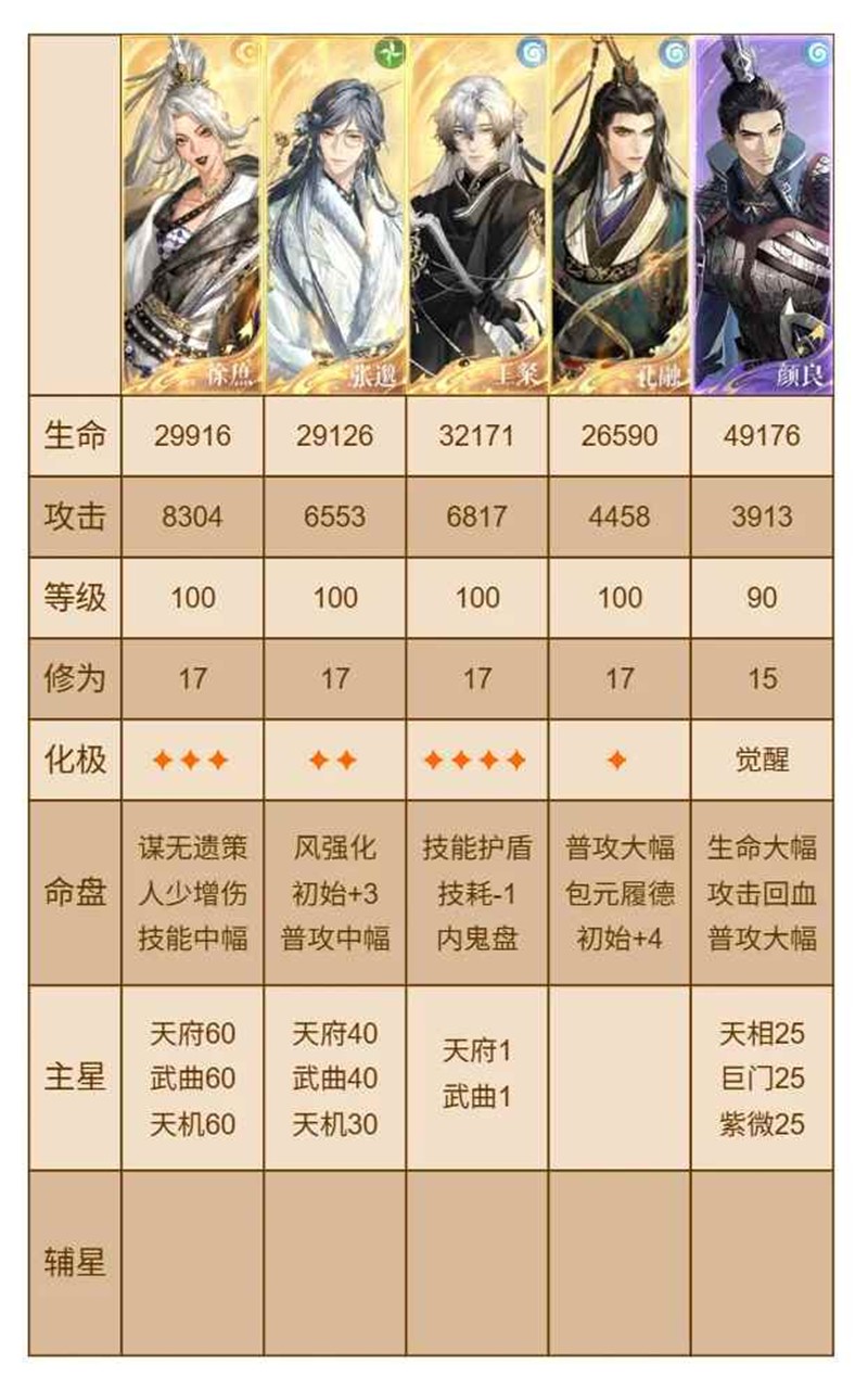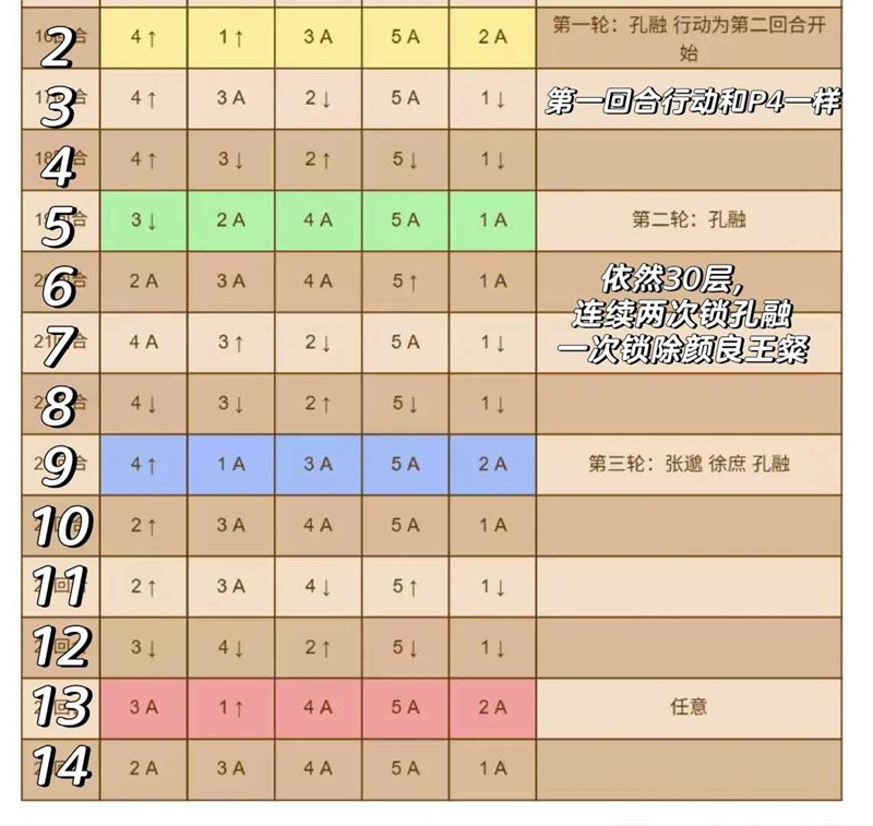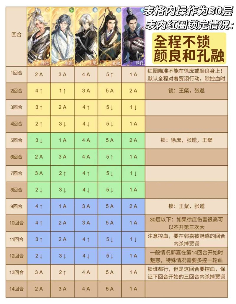 操作表内:不同颜色代表一个循环,表内的操作为30层,且全程不锁孔融和颜良。如果运气好全程没锁颜良和孔融可以直接照抄。