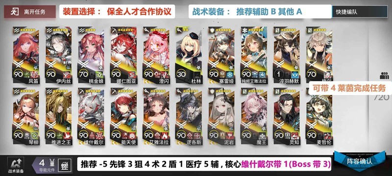核心:依旧采用维什戴尔单核(前面带1最后2关带3),装置推荐选保全人才协议(可带4莱茵多完成一个任务),装置直接给维,然后术士狙击干员直接叠维,维不会被替换掉(装置在场时)。