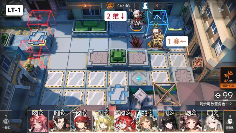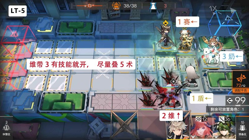 第五关:这关其实压力不小,挂机高台要再补一个输出,最好是叠5术士维然后带3技能,地面位没必要叠满,快速下两个盾是关键。