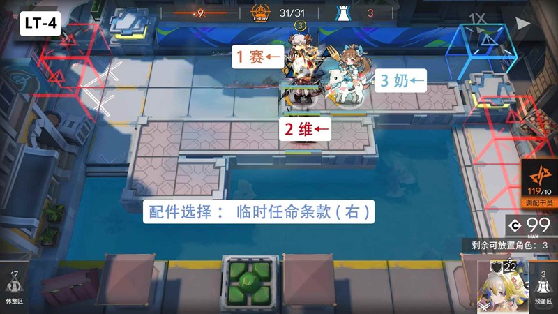 第四关:配件选右边的临时任命条款。这关投锋摆下面,注意早点下个奶或者奶盾,配件给维后可以多叠两个装备,单c即可。可以多补一个输出,最后几个怪挂机打挺慢的。