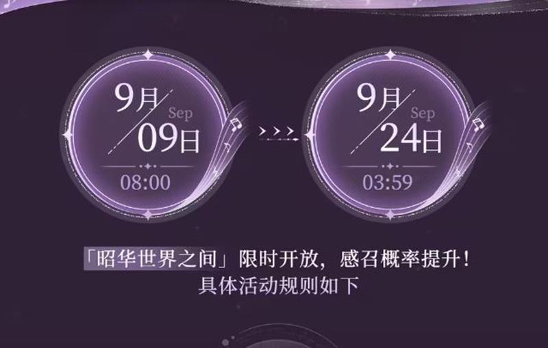 备受期待的《世界之外》游戏即将推出一项特别活动——夏萧因·昭华感召活动,该活动将于9月9日08:00限时上线,并持续至9月24日03:59。活动期间,玩家将有机会以提升的概率获得夏萧因世界品级侧影“昭华”。