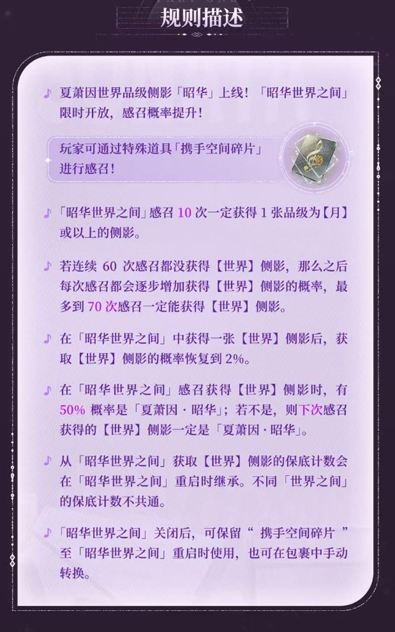 在活动期间,玩家可以通过特殊道具“携手空间碎片”进行感召。特别地,感召10次必定能获得一张品级为【月】或以上的侧影。此外,若连续60次感召都没有获得【世界】侧影,那么之后每次感召都会逐步增加获得【世界】侧影的概率,最多到70次感召一定能获得【世界】侧影。