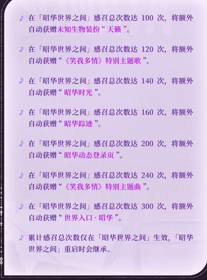 感召总次数达到特定数目时,玩家将获得额外奖励。例如,感召总次数达到100次,将额外自动获赠未知生物装扮“天籁”;达到300次,将额外自动获赠“世界入口·昭华”。这些奖励将为玩家的游戏体验增添更多乐趣。