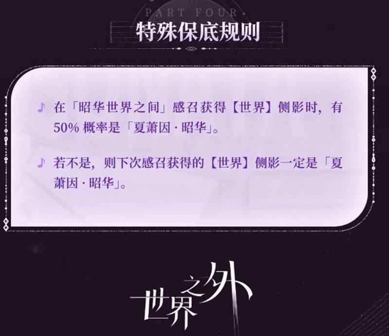 在“昭华世界之间”感召获得【世界】侧影时,有50%概率是“夏萧因·昭华”;若不是,则下次感召获得的【世界】侧影一定是“夏萧因·昭华”。