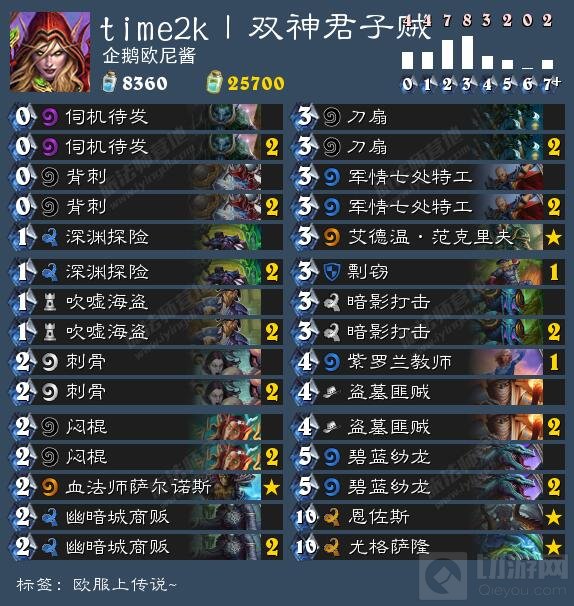 卡组介绍:最近国服兴起了向九四牧靠拢的七偷贼,而这套相比于七偷贼更加稳定,毕竟是上了传说的卡组,恩佐斯的作用是返场或者继续借对手的卡牌,萨隆就更加不说了,借完对手的卡牌之后,直接翻脸下萨隆斩杀对手即可。