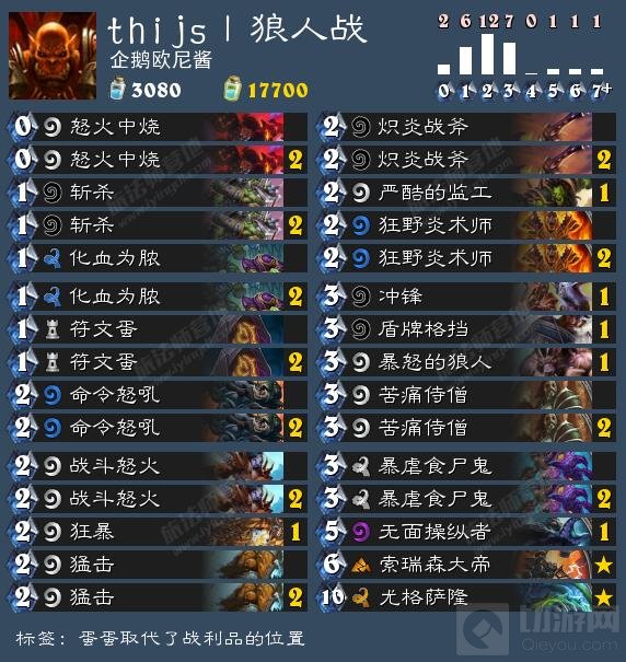 卡组介绍:最近的狼人战都带上了符文蛋,1费站场+监工非常赞。或者怒火过牌多一单位之类还有很多优点。这套牌最后还带了个10费战吼消灭一个玩家的橙卡,非常不错的卡组哦~