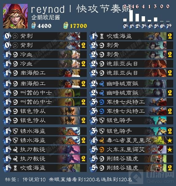 卡组介绍:还有一个版本是带两个1费12激励,去掉两个迪菲亚,对了,带上穆克拉也行。王健林曾经说过我们打炉石,首先要完成一个小的目标,比如先干死所有快攻。而这套贼就是真正的快攻杀手,天下武功,唯快不破,这套节奏感爆棚,非常之外。