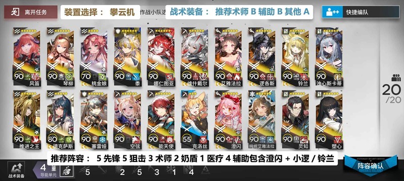 常规保全阵容,核心为澄闪+逻各斯/铃兰(小逻好一些)+赛雷娅/黍,相比同期交战荒野操作简单不少。抓牌按自己喜好即可,推荐抓狙击术士,叠装置的话4狙击2术士左右差不多就行。