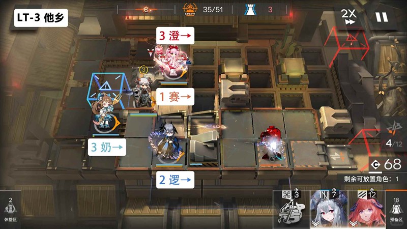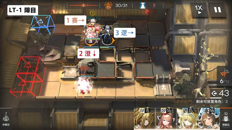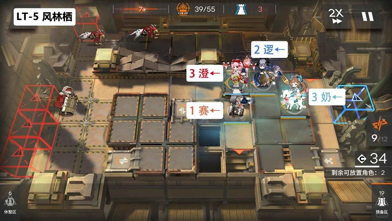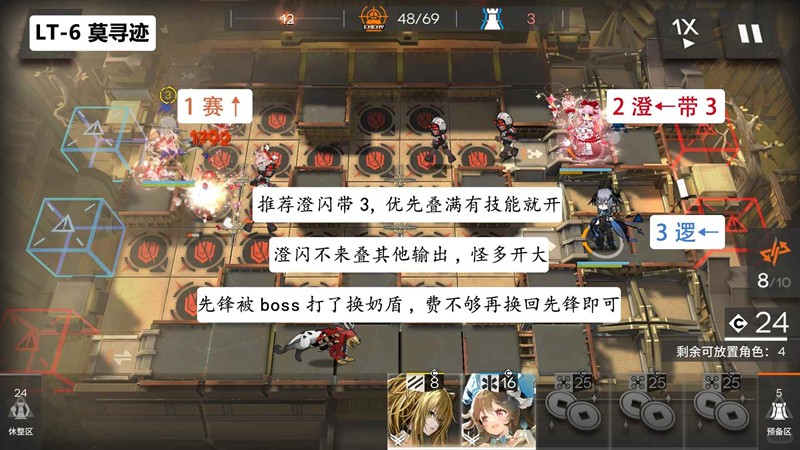 第六关:开局直接右侧放高台输出,推荐带澄闪3技能且优先叠满装备,然后澄闪有技能就开即可稳定通关。右边两输出叠到高层装备也能挂机,boss直接放生即可,只会扣一血。等boss从蓝门离开放先锋回费,boss回来就换成奶盾,费用不够再替换成先锋,阵容成型再换成奶盾防止漏人。