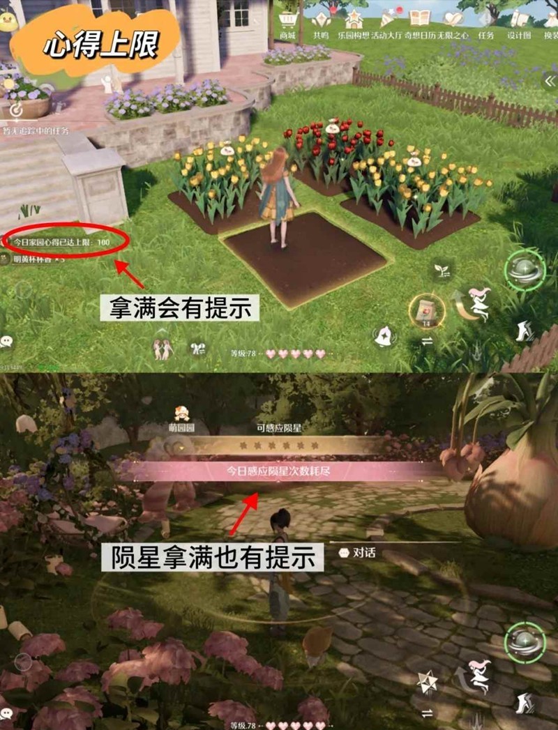 心得获取:播种+2、浇水+2、收获+5、采星+10、家具制作+5、扔鱼苗+2、喂鱼+2等,刷满100不难