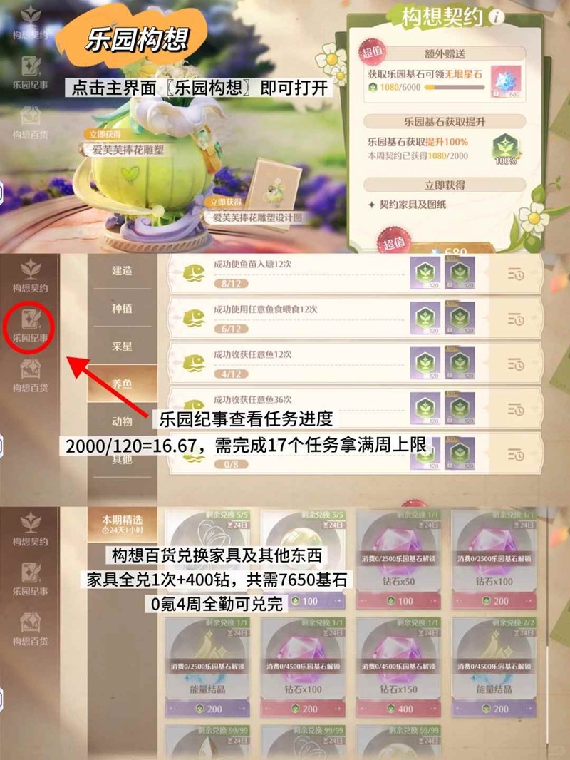 2000上限/周,基石用于兑换家具/钻石/噗灵/丝线/泡泡等;通过完成不同的建造/种植/采星/养鱼等任务获取,可在乐园纪事中查看具体任务