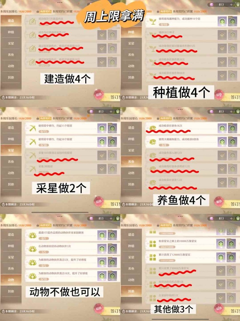 需注意!连续3天刷满心得才能解锁完目前5种能力。连续2天刷满心得可以解锁建造、种植、采星、养鱼4种能力,就足够拿满第1周的基石2000周上限
