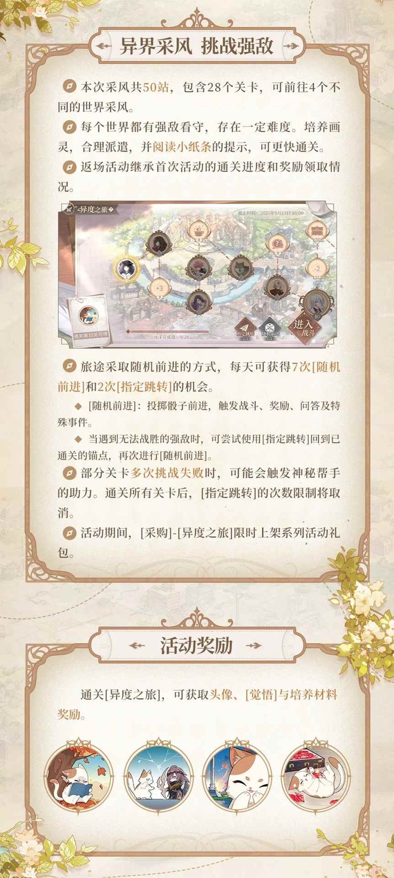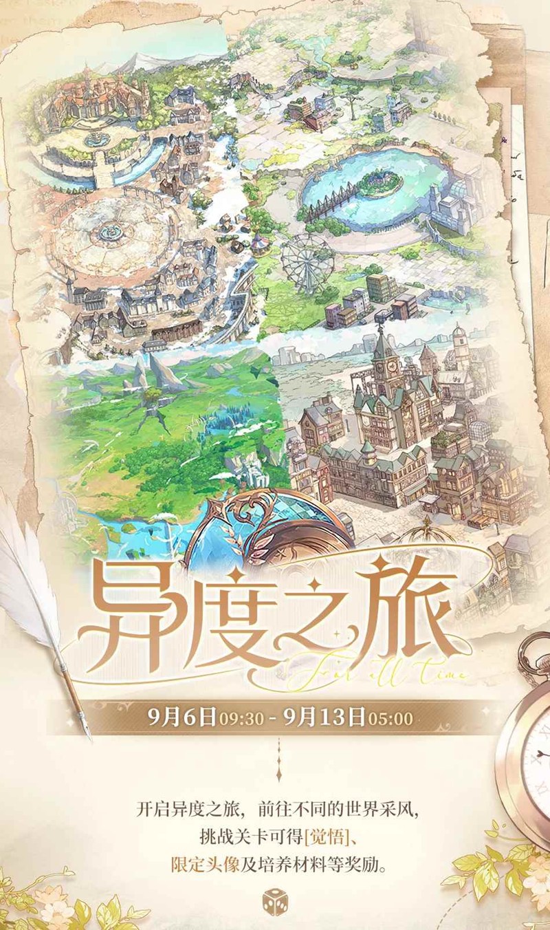 9月6日09:30 - 9月13日05:00,采风「异度之旅」限时返场,参与活动可得限定头像、[觉悟]等珍贵奖励。