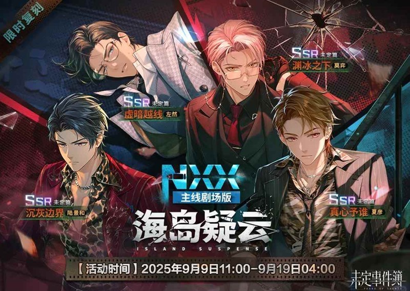 活动期间,可使用【女神之泪·限时】或【女神之泪·谍海】启示,每次启示可获得【泪之痕·谍海】×1。「NXX-海岛疑云」活动限定SSR思绪:夏彦【真心予谁】、左然【虚暗越线】、莫弈【渊冰之下】、陆景和【沉灰边界】概率提升,每100次启示内必得活动限定SSR思绪
