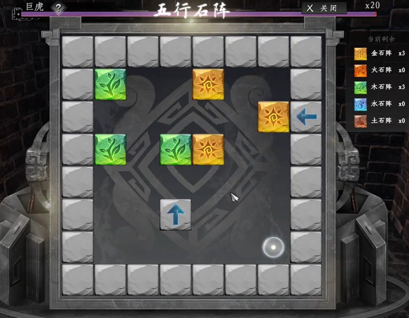 在地宫的某一层,玩家需要找到被锁住的房间,并在旁边的房间内解决五行石阵谜题。谜题要求利用箭头石块与移动元素石块完成三消,所有元素石块消除后机关便会打开。每次解谜内容不同,失败后可反复尝试,无需担心次数限制。成功后回到主房间,打开宝箱即可获得誓盟碑三件套。