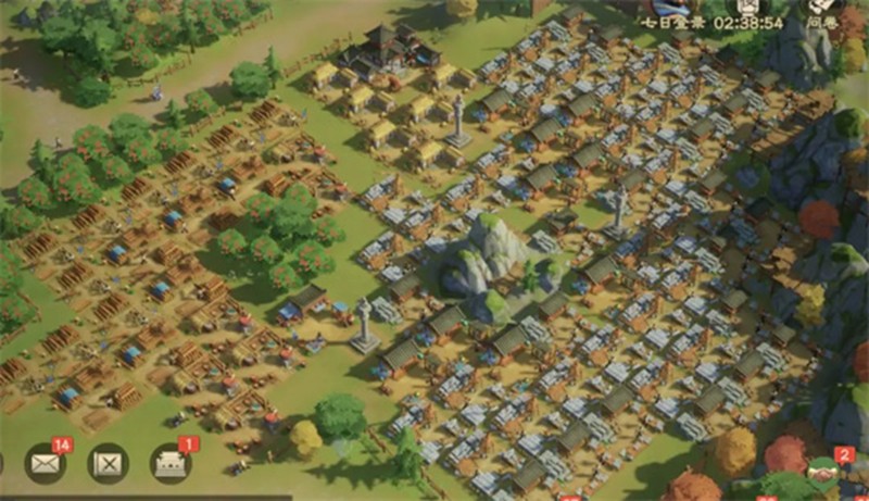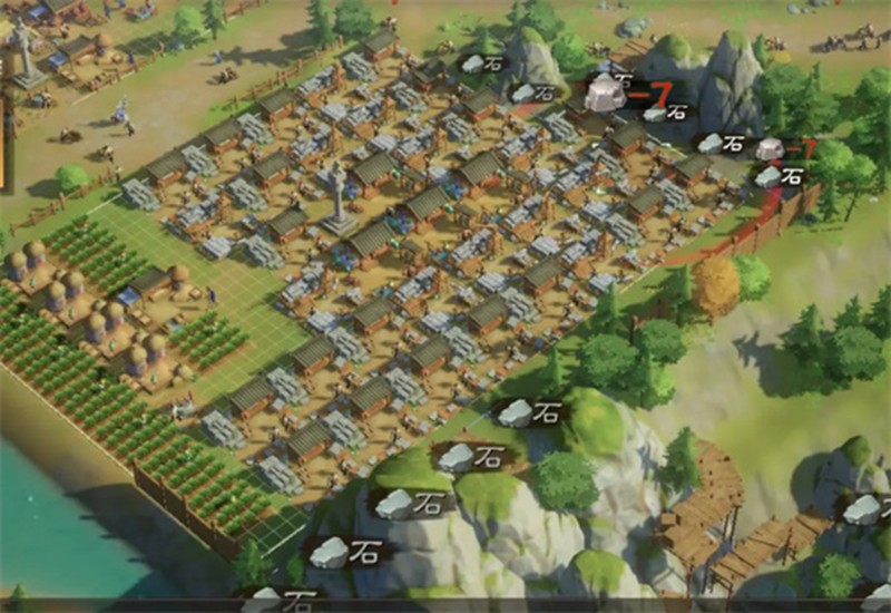 知春苑的右方和下方有丰富的石头资源,左下则是大量的水资源。玩家可以在外围先布置田庄和凿石所,再逐步向内扩展各类建筑,这样既能保证资源的获取,又能提升整体发展速度。