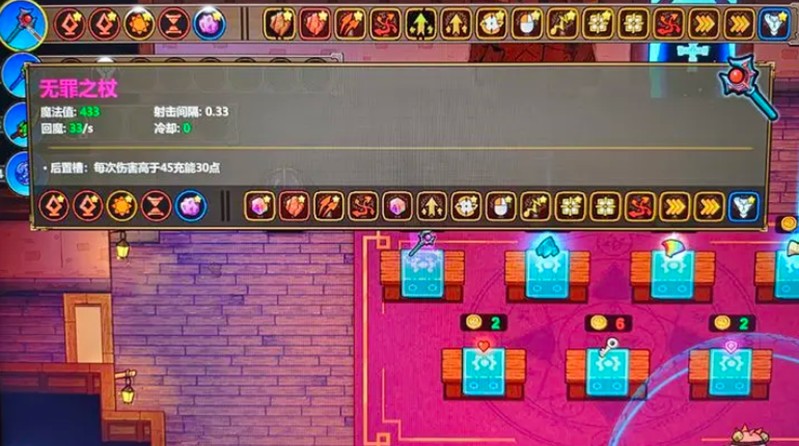法杖作为核心战斗工具,其属性体系相当复杂。顶部的白色数字代表基础数值,下方的黄色文字是动态变化的附加词条,两者共同决定了装备的整体表现。圆形凹槽用于安装主动法术,方形孔位则用于后缀强化。魔法值参数尤为关键,它直接影响角色施法能力,未获取特定遗物前,角色完全依赖法杖提供能量。