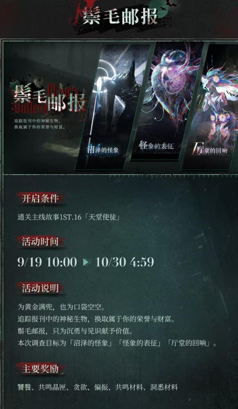 活动时间为9月19日10:00至10月30日4:59,主要奖励为饕餮、共鸣晶体、贪欲、偏振、共鸣材料、洞悉材料等。