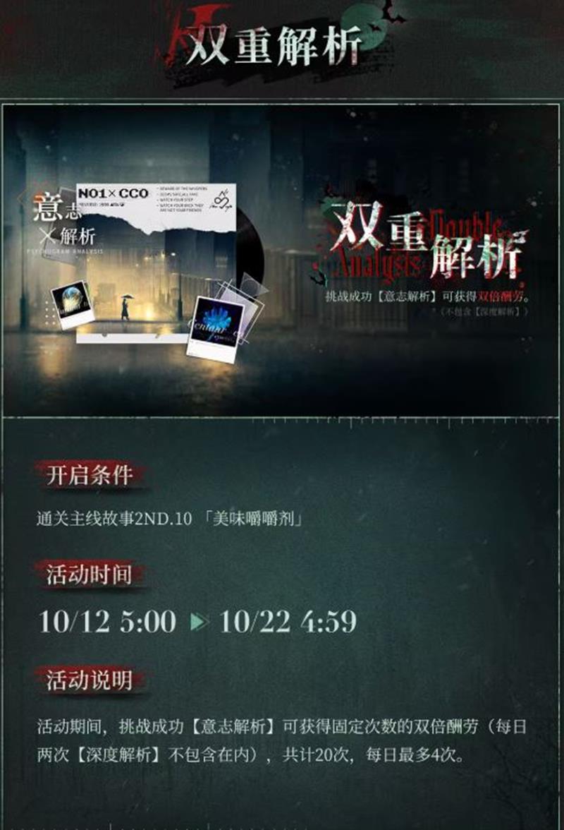 活动时间为10月12日5:00至10月22日4:59,挑战成功【意志解析】可获得固定次数的双倍酬劳,共计20次,每日最多4次。