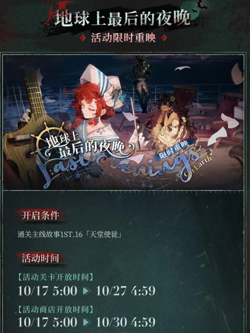活动限时重映,活动时间为10月17日5:00至10月30日4:59,主要奖励为「鸥声信笺」、独一律、养成材料。