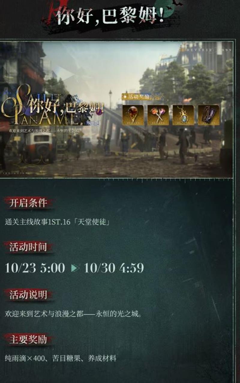 活动时间为10月23日5:00至10月30日4:59,主要奖励为纯雨滴×400、苦目糖果、养成材料。