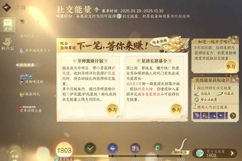 获取方法汴京(1006,637)试剑人机:和师徒/结义/小芽组队后对话阮映选择“试剑天下”开启挂机模式,每局3分钟可得80点雨露值,40分钟内可刷满1000点;每周预计转换社交100点
