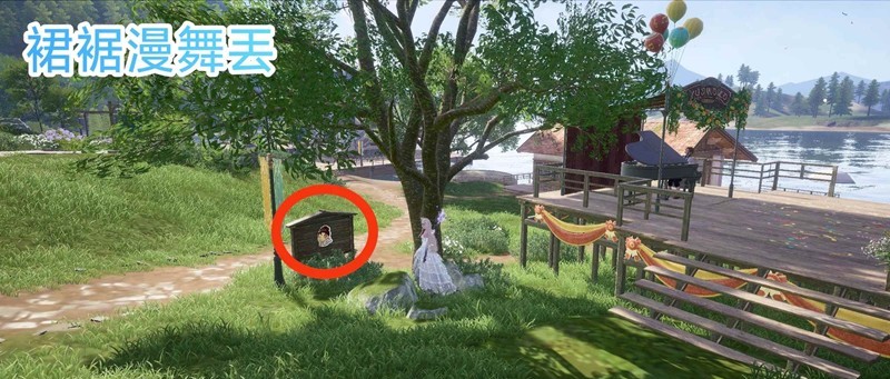 在花愿镇湖畔街区的湖边有个舞台,史丢丢在舞台旁边的公示板上。最近传送点:镇长宅邸前