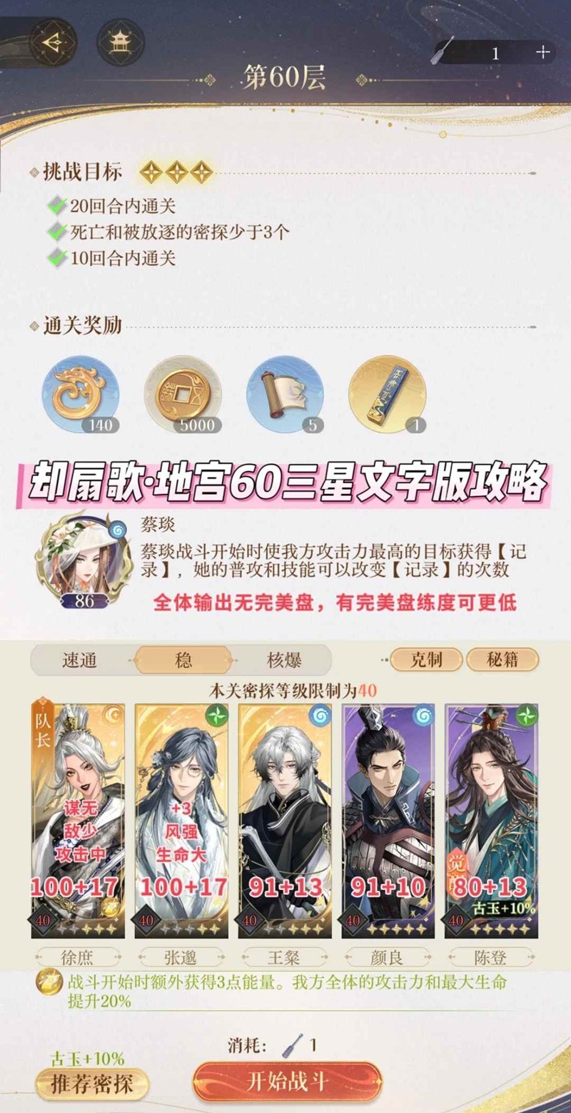 以上就是如鸢袁基地宫却扇歌·地宫60三星文字版攻略的全部内容了,更多游戏资讯,攻略内容敬请关注切游网,您的支持是我们努力的动力!