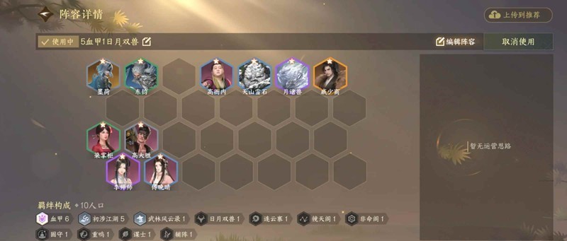 前期先凑3初涉d衙内,衙内出了,留衙内和两个初涉棋子(婉晴>梁掌柜>高大胜),剩下位置给血甲。