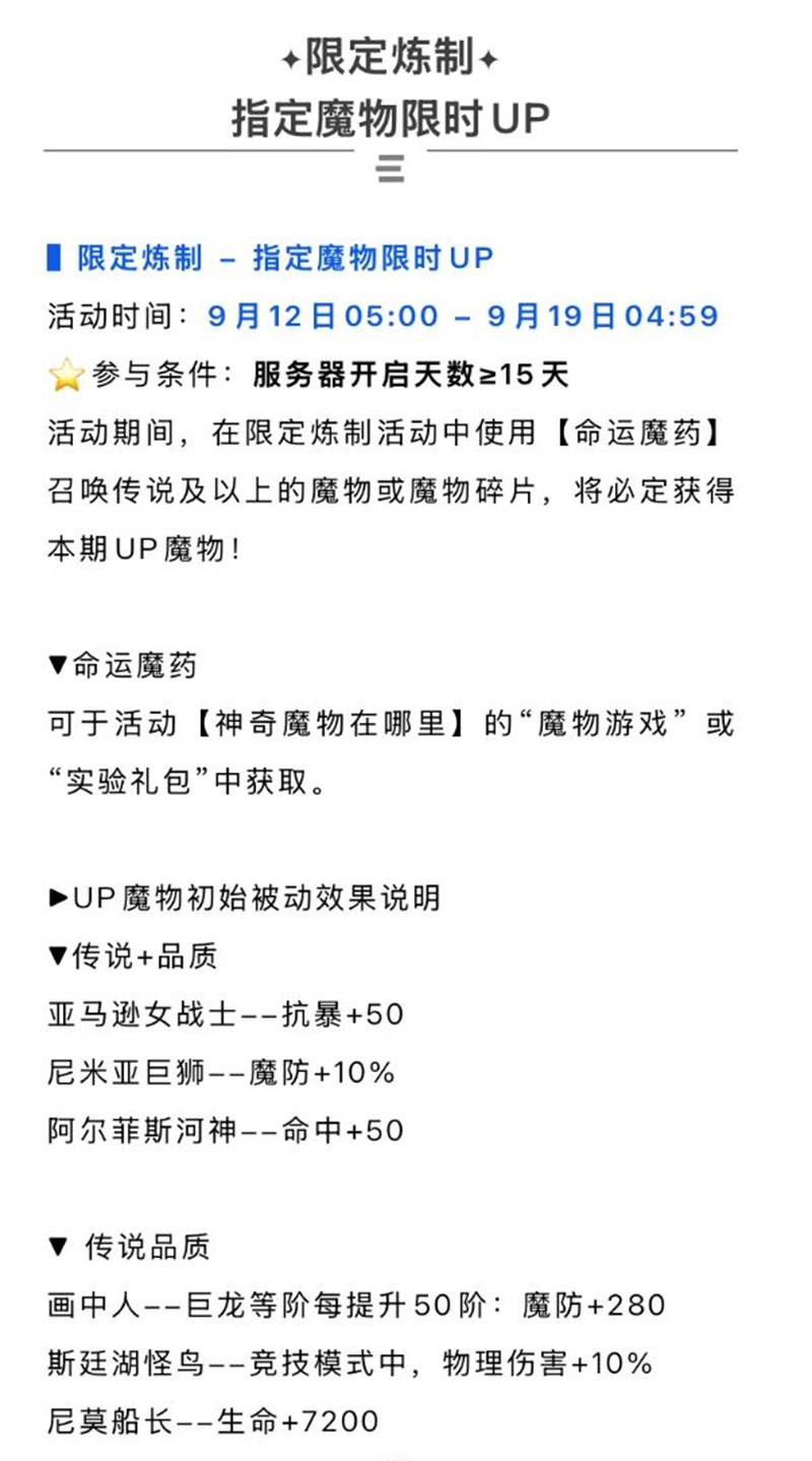 在活动期间,使用【命运魔药】召唤传说及以上的魔物或魔物碎片,将必定获得本期UP魔物!命运魔药可在活动【神奇魔物在哪里】的“魔物游戏”或“实验礼包”中获取。