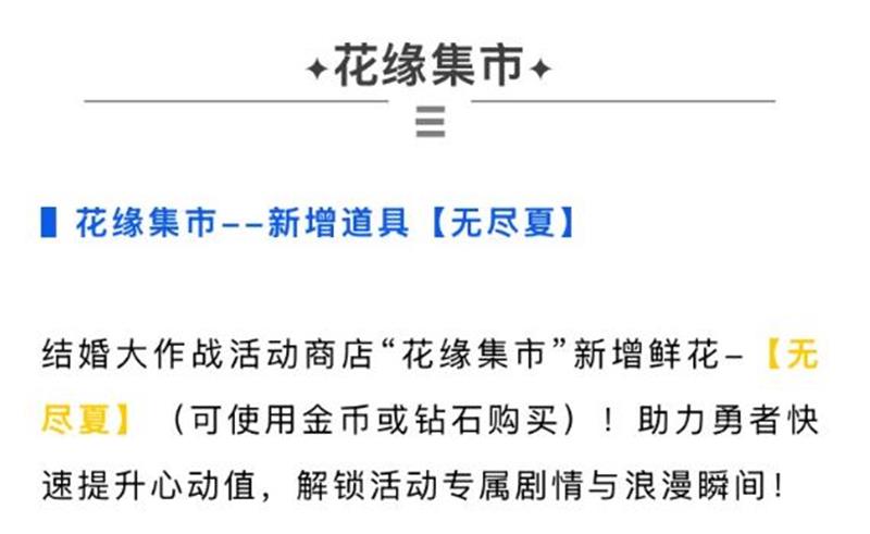 结婚大作战活动商店“花缘集市”新增鲜花-【无尽夏】(可使用金币或钻石购买)!助力勇者快速提升心动值,解锁活动专属剧情与浪漫瞬间!