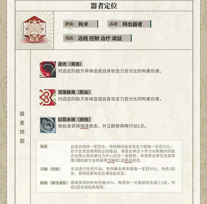 物华弥新游戏中有着众多角色,他们被称为“器者”,分为轻锐、远击、宿卫、构术、战略五个职业,特出、优异、新生三种稀有度。那么器者睡莲应该怎么用呢?大体来看一个绑定dot的秦公镈2.0。这里给少爷小姐们分析一下技能,一起来和小编看看吧~