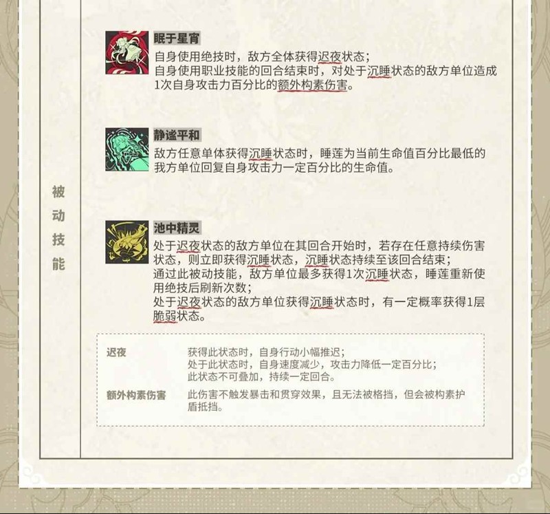 ❹被动一:开绝技后,敌方全体速度降低,攻击降低,自身回合结束对沉睡敌人造成一次额外构素伤害。(这个伤害不能解除沉睡,算是直接强控,高速应该是配合队友打单体爆发用)