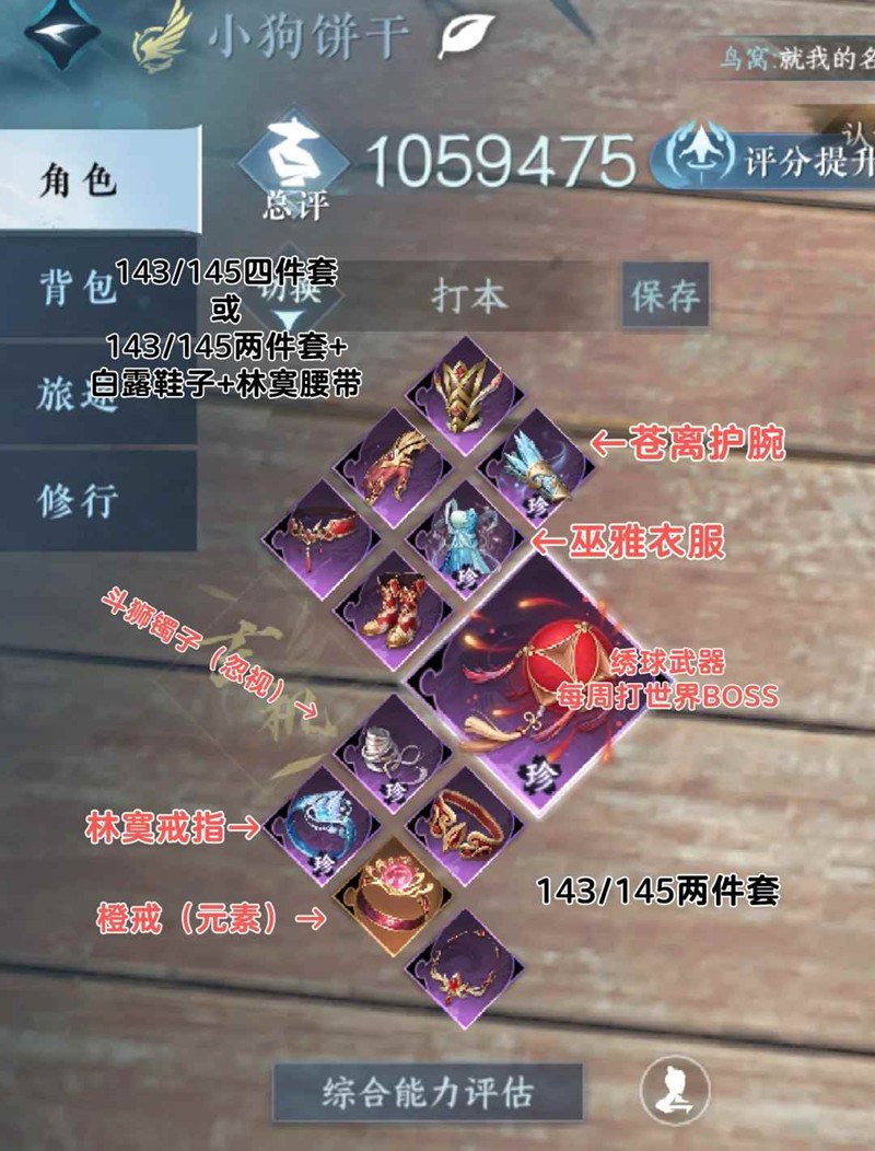 上身:苍离护腕+巫雅衣服+(143/145四件套或者白露鞋+林寞腰带+143/145两件套)