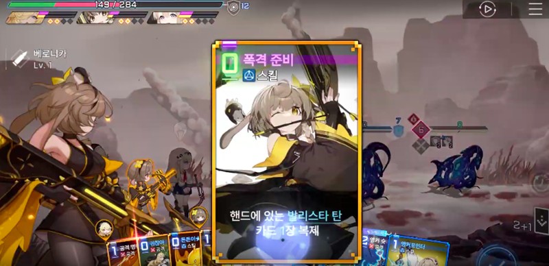 钢铁之雨的核心技能围绕着弩炮展开,她的固有技能是生成一张弩炮卡,每回合开始时自动触发,对敌方造成伤害。玩家可以通过速射卡和闪避卡来增强她的战斗表现,速射卡能造成100%的伤害,而闪避卡则能生成100%的护盾。随着等级提升,她还能解锁更多技能,包括吸气、决心吊坠、黑角宿一勋爵以及准备轰炸等,这些技能进一步提升了她的战场适应性。