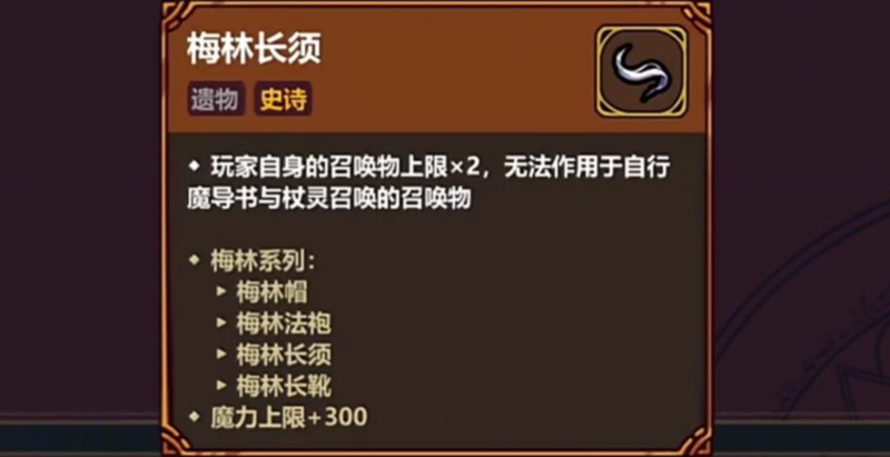 无尽药瓶在药水用完后有30%几率获得一瓶新药水,适合持续战斗的玩家。疗愈腰带在使用药水时同时提升血和蓝上限,但受概率限制,效果不会特别显著。梅林长须提升召唤物数量,对召唤流玩家非常关键,非召唤流玩家则作用不大。守护精灵让玩家拥有三个可拦截法术的精灵,对法术防御有明显提升。