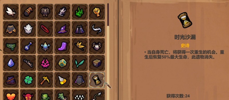贪婪金杯在进入新区域时额外获得金币,百分比为5%,与其他金币类遗物搭配效果更佳。树精肩甲每次进门获得3点护盾,虽然数值不高,但获取简单且无副作用。时光沙漏提供一次重生机会,重生后保留50%生命值,但使用后遗物消失,需谨慎使用。