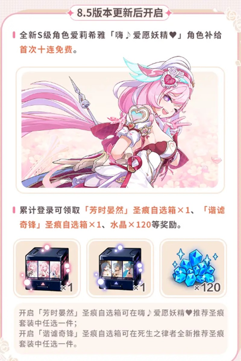 每日登录可以帮助玩家按天数来逐步的解锁各种奖励,通过每天签到可以获得10张装备补给卡,签到过程中还可以获得一枚九周年的专属纪念徽章,这枚徽章的设计融合了游戏的经典玩法与周年庆的主题,非常具有收藏价值,并且每日签到资源,也可以让玩家能够轻松的获取基础的资源,在抽奖池中针对s级角色,为大家提供了一次免费10连抽的机会,每个玩家都不用消耗自身的水晶,就可以参与到抽奖中去,完成抽奖后还可以解锁签到活动,累计签到达到指定的次数就可以领取一个圣痕自选箱,其中包含两套不同的圣痕,玩家可以根据自身的阵容搭配来选择需求的套装。