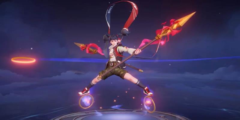 经典的丸子头搭配精致的项圈,运动外套与“NAZA”T恤的组合展现出哪吒的活力与帅气。混天绫经过重新设计,以白黑红三色切割并点缀哪吒玩偶装饰,与外套左臂的绣章和T恤图案相互呼应。脚底的风火乾坤圈位置调整至外侧,双手的三尖枪被火焰缠绕,让哪吒在峡谷中也能展现出强大的战斗力。