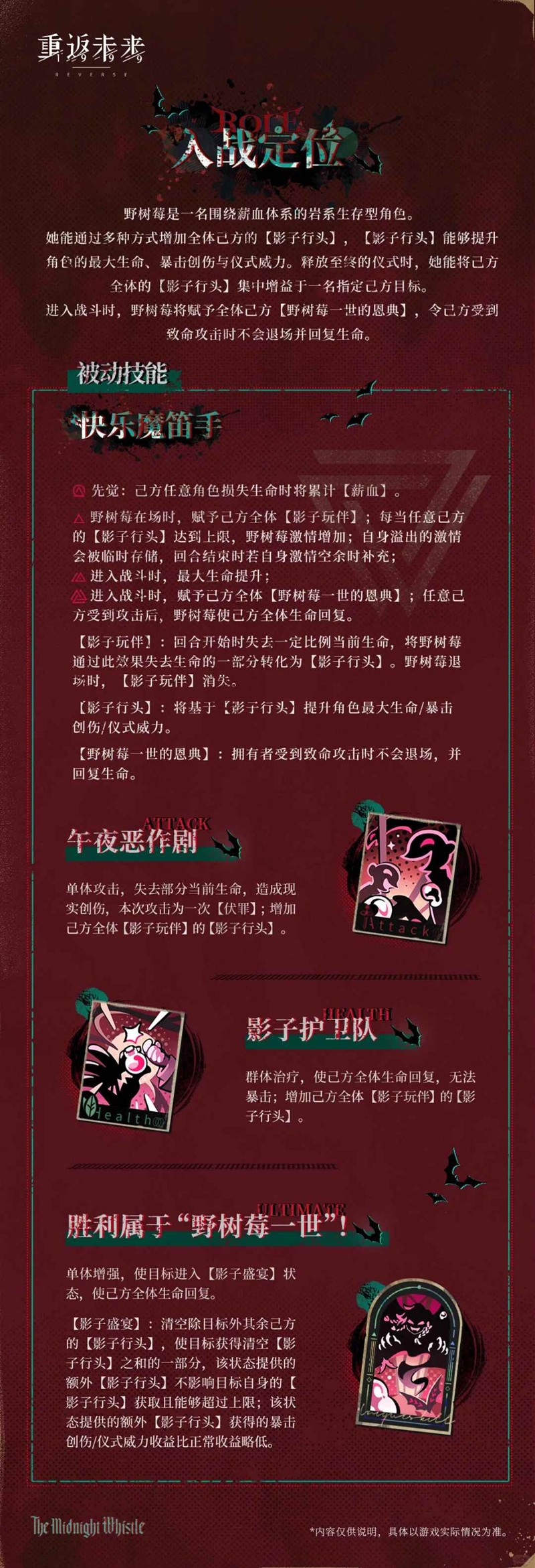 1技能对单个敌人造成伤害+提升我方全体的(影子行头)数量(上限时野树莓增加激情,自带激情存储)攒够激情时释放仪式,为我方全体回复生命,并指定的一个角色挂上(影子盛宴)