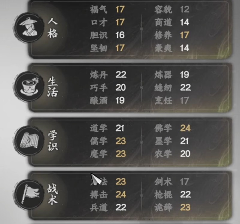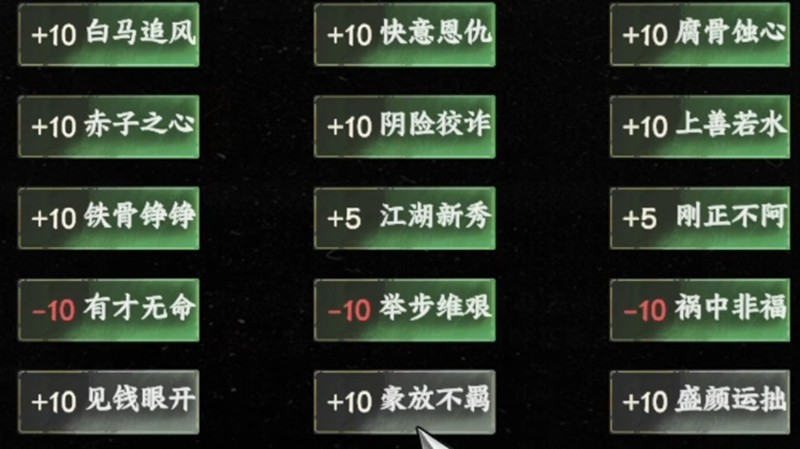 除了天赋之外,初始属性同样值得关注。非战斗属性如修养会影响支线任务的完成情况,而生活技能如炼丹、缝纫等则能帮助玩家制作道具。如果选择“腐骨蚀心”天赋,可以增加10点毒术,配合高炼丹技能可制作强力毒药。而“刚正不阿”则能提升儒学,触发正派剧情,适合走剧情路线的玩家。