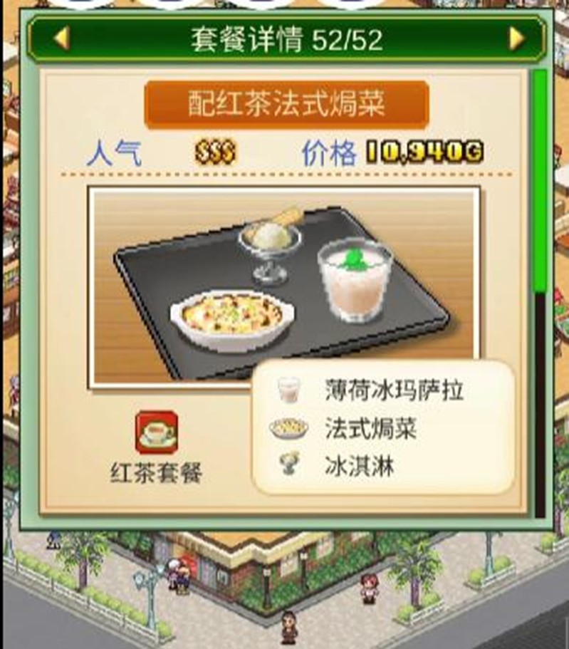 甜味套餐适合喜欢甜美口感的顾客,尤其是女性用户。饮品方面可以选择豆沙咖啡或热柠檬汁,这两种饮品都带有明显的甜味特点。配菜则可以搭配红豆汤或水果芭菲,这样的组合既符合甜味主题,又能带来清爽的口感体验。通过合理的搭配,玩家可以提升顾客的满意度,并增加咖啡馆的吸引力。