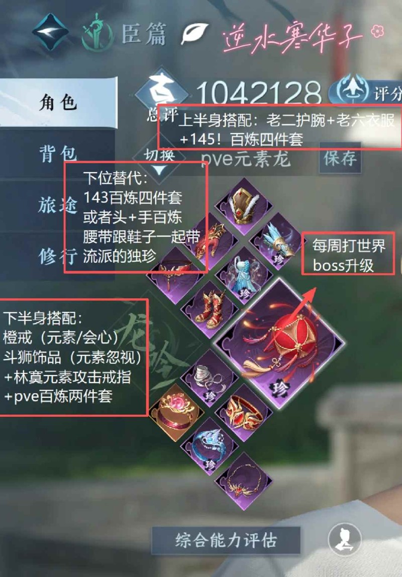 下半身搭配:橙戒(元素/会心)斗狮饰品(元素忽视)+林寞元素攻击戒指+pve百炼两件套