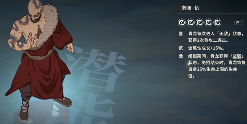 青龙不仅拥有天赋带来的无敌效果,还具备自动技,可以在己方角色使用怒气时为他积累充能。当充能达到6点后,青龙可以开启主动技,获得6秒的无敌时间。两种不同的无敌方式让青龙的坦度大幅提升,同时也能与他的绝招形成配合。释放绝招时,青龙会扣除20%的血量,进入特殊的神通显示状态,此时输出能力显著增强,还能获得爆伤和暴击加成。不过,一旦血量低于5%或阵亡,绝招就会立即结束。因此,合理利用无敌状态来延长绝招时间是关键。