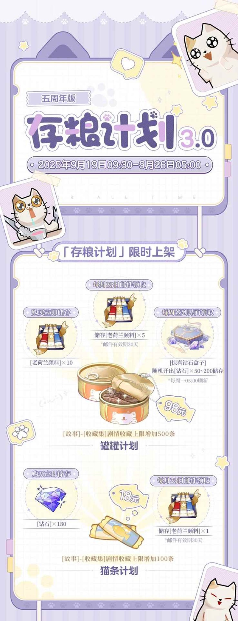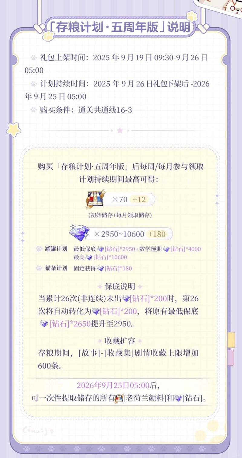 9月19日09:30 - 9月26日05:00,五周年储蓄推送礼包[存粮计划]上架。购买并参与储蓄,累计得[老荷兰颜料]*82、[钻石]等奖励。