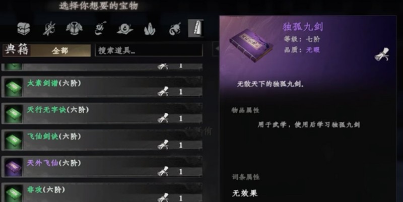 成功获得“天外飞仙”之后,接下来的任务是加入仙洲地区的“归墟剑宗”。可是,这也只是个开始。想要得到独孤九剑的秘籍,还得往上爬,成为门派中的亲传弟子。成为亲传弟子可不是那么容易的,你得完成门派的任务,不断提高自己的声望。在这个过程中,努力的付出肯定是有回报的——一旦成为亲传弟子,你就能通过门派的兑换系统,拿到独孤九剑这本绝世秘籍。